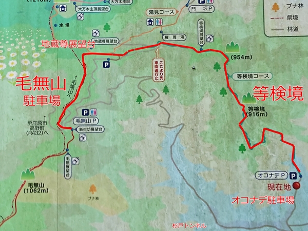 吉田町側のオコナデ駐車場登山口から登り、等検境や地蔵尊を経て、