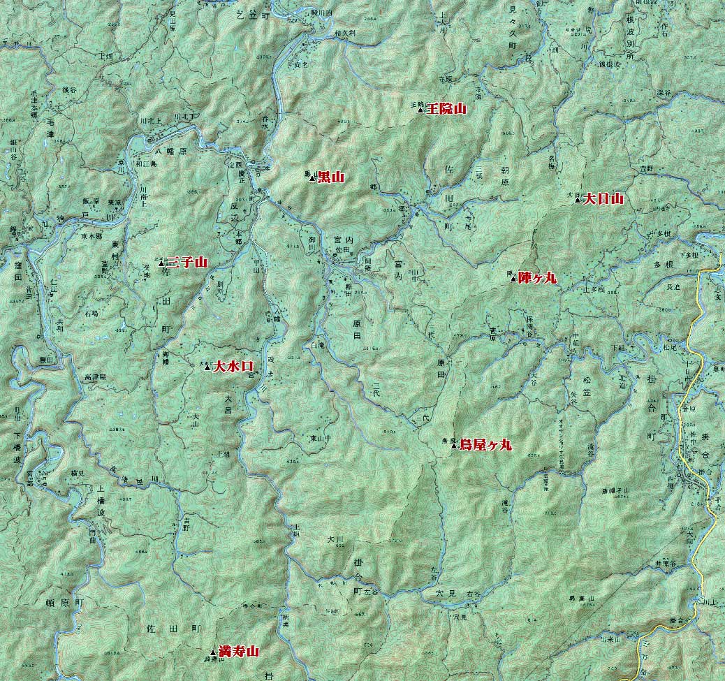 「佐田の国にはこの王院山以外に黒山、 陣ヶ丸、 三子山、 大水口、 鳥屋ヶ丸、 大日山、 満寿山と7つの山がある。