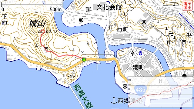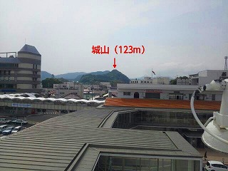 西郷港ターミナル後方に城山(標高123m)の山容を見ることが出来ます。