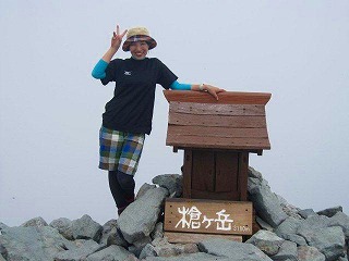 記念撮影もばっちりすませ、槍を堪能(ガスで景色はちらっとしか拝めませんでしたが・・)