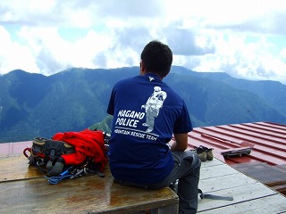 11時頃 長野県警山岳救助隊員の背中に見守られながら北穂高岳から涸沢岳を通って、穂高岳山荘へ向け出発。気をつけて行きましょう!