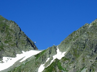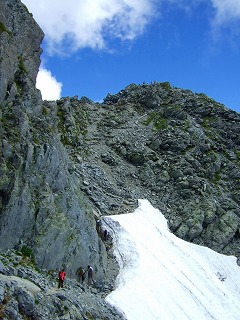 涸沢岳にもうすぐのところで怖くて下りてこれない中学生が・・・先生の引率つき。