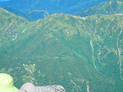 EASYチーム宿泊の鏡平山荘が見えた。(中央の赤い屋根)