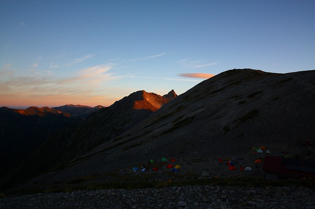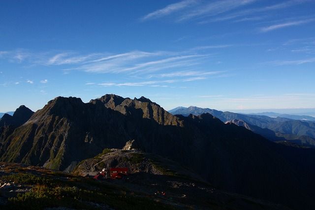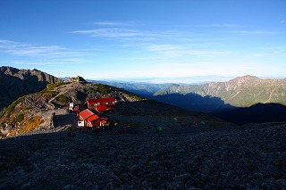 現在いるのは南岳小屋(中央)。日が昇るのは東の常念山脈。