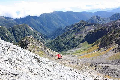 コースを変更し、このまま槍平小屋に下山することにした。(軟弱者と言われても構わないさ。早くビールを飲むほうが大事なのだ。)
