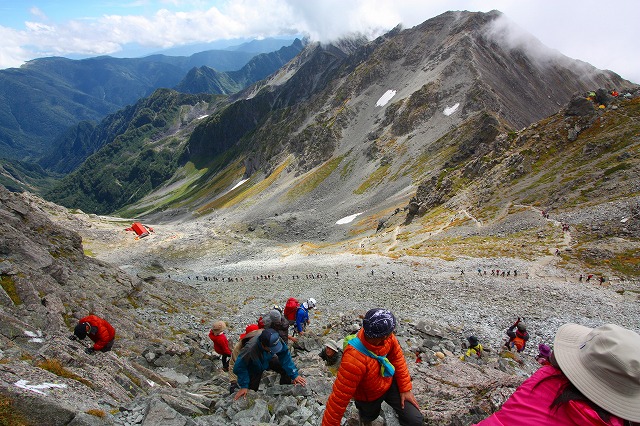 槍沢を見下ろすと続々と登山者が登ってくるのが見えた。
