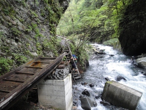 ちなみにこれはどうやって歩くかと言うと、金属のはしごを下りると川縁に少しだけ歩けるスペースがあります