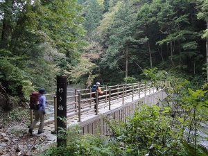 橋の隙間から下が見えるのが怖いらしく、かなり腰の引けた歩き方になっています