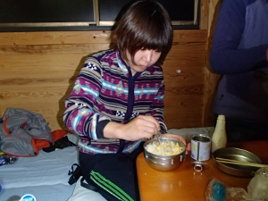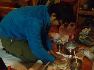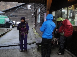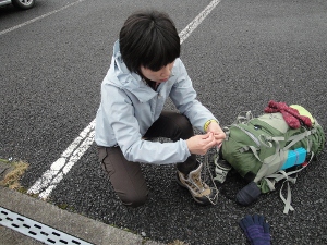 なぜか登山靴に紐を通すところから準備が始まるかにちゃん