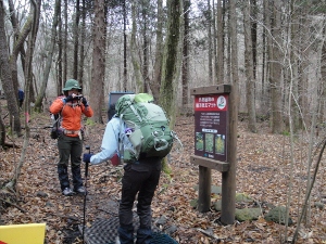 さて、登り始める前に、植生を守るため靴の裏に着いた種を落とします