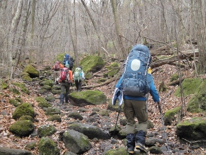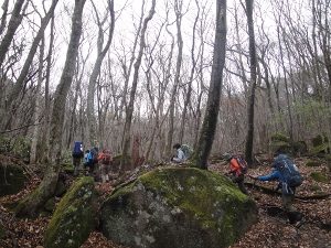 苔生した登山道を行くこまキャンメンバー