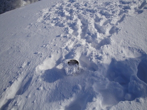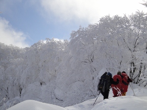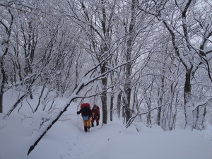 かんじきを履いているのは一人だけで、他の二人はつぼ足のままの様子