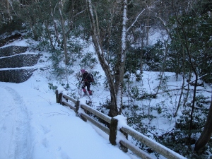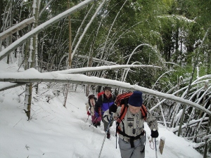 途中の竹林では雪の重みで竹が思い切りしなっています