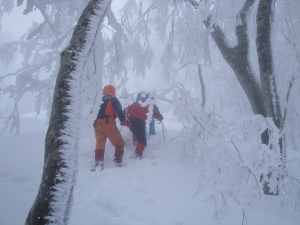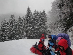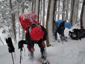 杉林に入ると雪が少なくて歩きにくいのでワカンをはずします