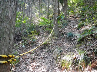 踏み跡をたどっていくと、ロープが張ってある急登にたどり着いた。