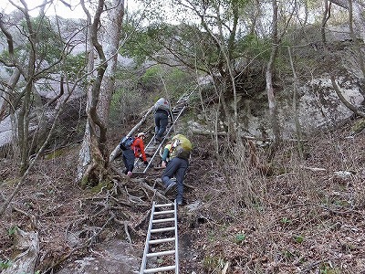 さっそく現れたハシゴ! 一人ずつゆっくり通過します。