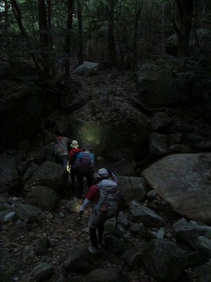 まだ薄暗いのでテープも見えず道も分かりにくい・・・ より慎重にルートを探します。