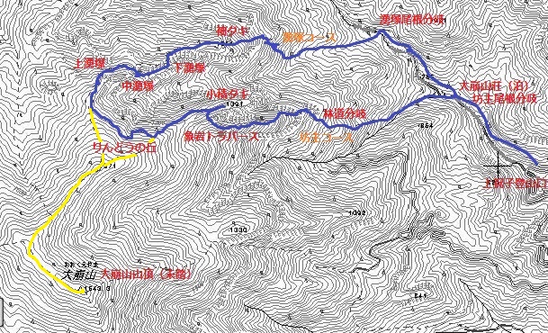 青線が実際の行動ルート、黄線が予定していた山頂へのルートです。