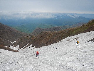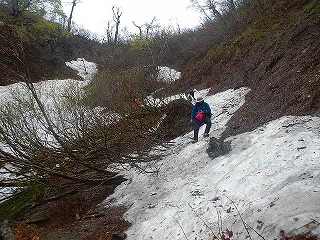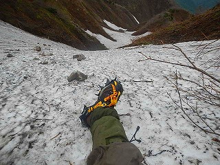 上部になるにつれ、残雪が多くなったのでアイゼン装着…