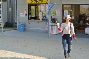 ソフトクリームを購入して嬉しそうなもりちゃん