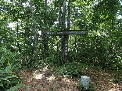 県境のアップダウンを進むと、稜線上の通過点に山頂標識がありました。