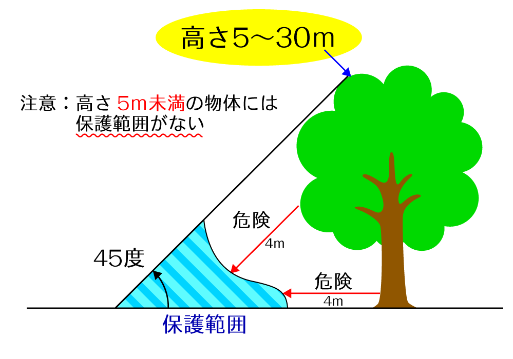 ・高い物体(樹木、岩)の保護範囲外に留まらない。側撃雷(直撃を受けた物体の近傍にある別の物体に再放電を生じて電流が流れる)の可能性があり危険。