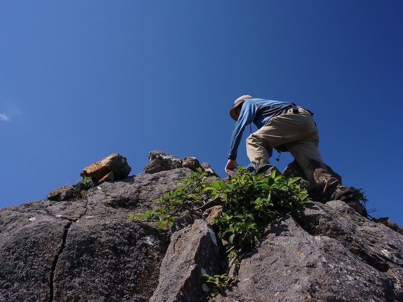 枝が茂って足元が悪い尾根を縦走し、親指ピークに到着。