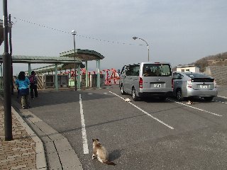 フェリー待ちをしている車一台一台に、エスコート猫が