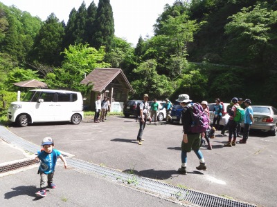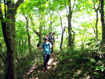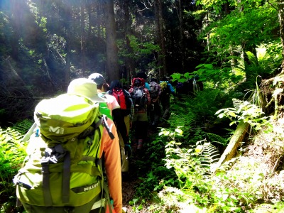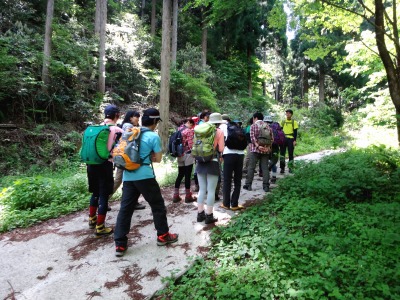 新緑のまぶしい沢沿いの道を少し行くと、やがて植林帯の急坂へ。