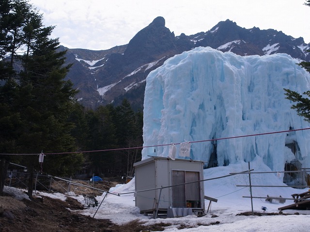 この山小屋は年中無休で営業しているのだが、冬季には人工の氷壁を作り、アイスクライミングのタイムトライアルなども催しているのだとか。通称、アイスキャンディー(下図)。もっとも、GWも過ぎた五月のこの時期は、氷も融けて立ち入り禁止になっている。