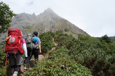 青年小屋を出発し、次なるピーク・権現岳に向けて歩みを進めるHARDチーム一同。