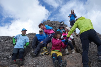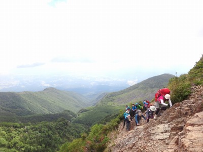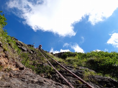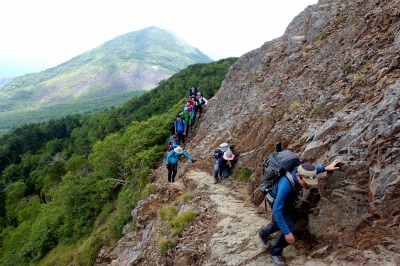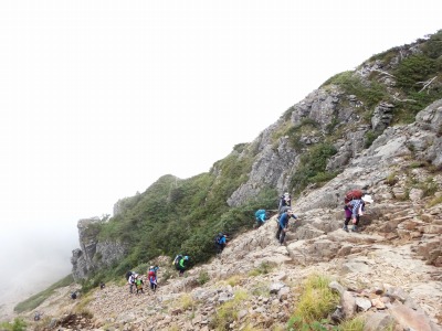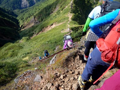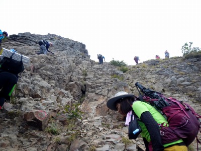 急な岩斜面の登り。三点支持で慎重にいきます。