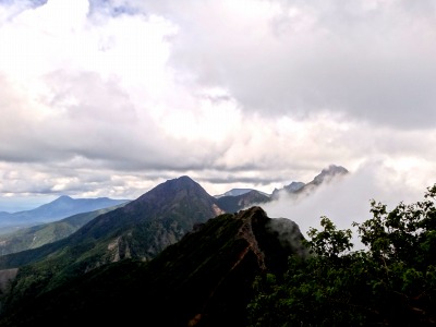 前方には阿弥陀岳と、雲に隠れた赤岳の姿… はるか後方には蓼科の峰。