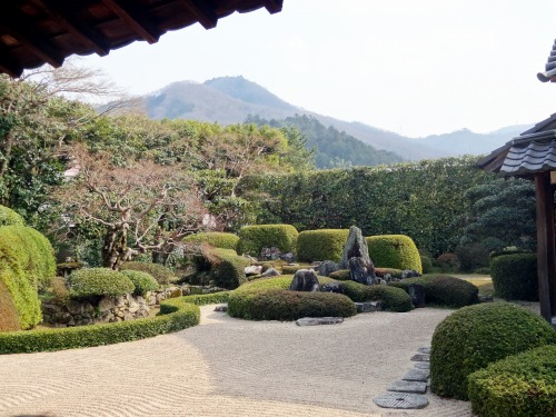 白砂を水面に、躑躅を大浪に見立てた枯山水の庭園。 愛宕山の借景も見事である。