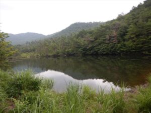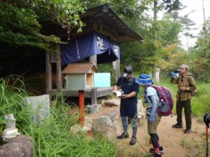 ほぼ中間地点の古池に到着。ここにはお堂と登山日誌を記入できるところがあります。