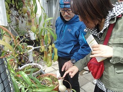 温室内にある食虫植物。中を覗き込むしゅうちゃん。