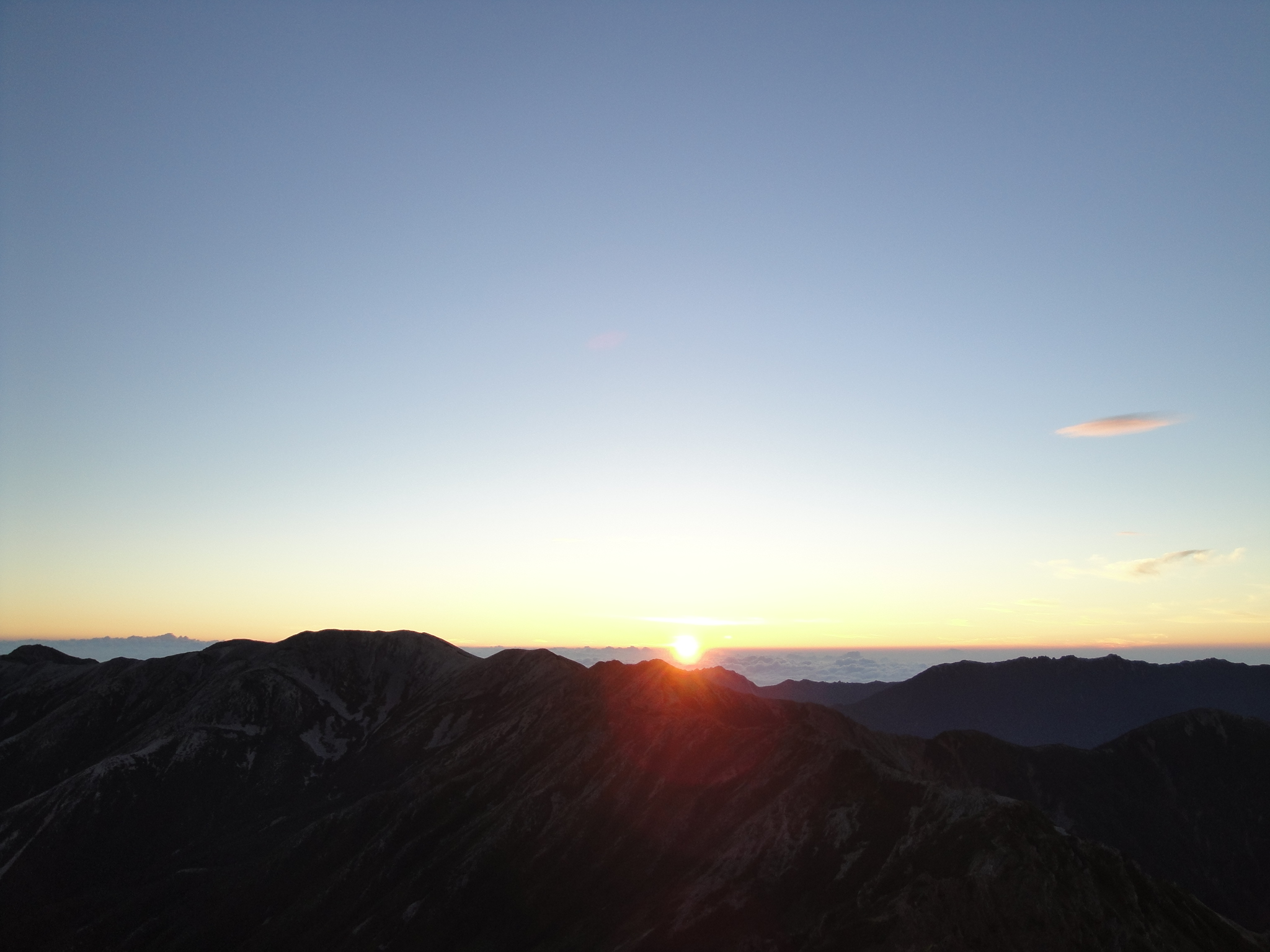 夕方小屋の外に出たらワリモ岳(右)と明日超える予定の鷲羽岳(ワリモの奥)、そして遠くに槍ヶ岳が見えました。