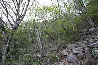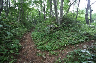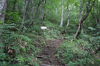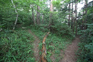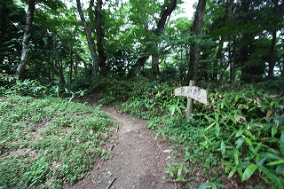 道標はない。山頂へ行くには左に進む。右へ折れる東坂への横手道は見逃しやすいので注意。