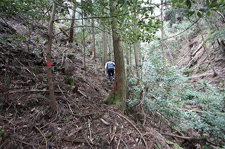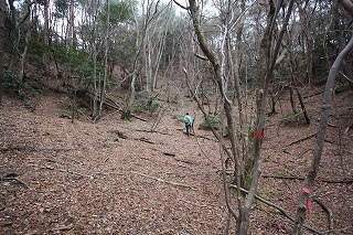 ②急斜面になる。赤テープを頼りに進む。
