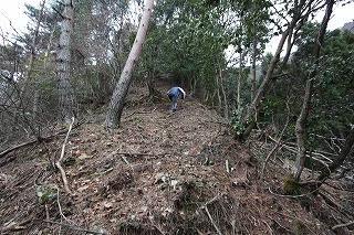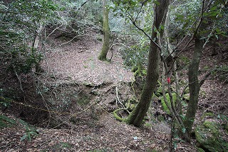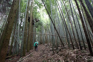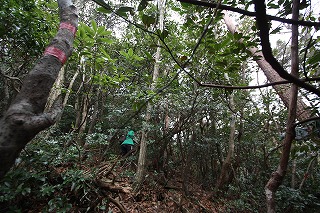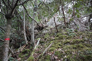 ①林道の終点から真っ直ぐ進む。竹林を過ぎ、赤テープの印を頼りに歩く。