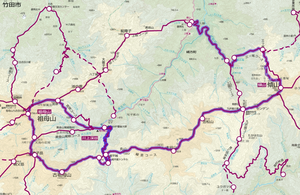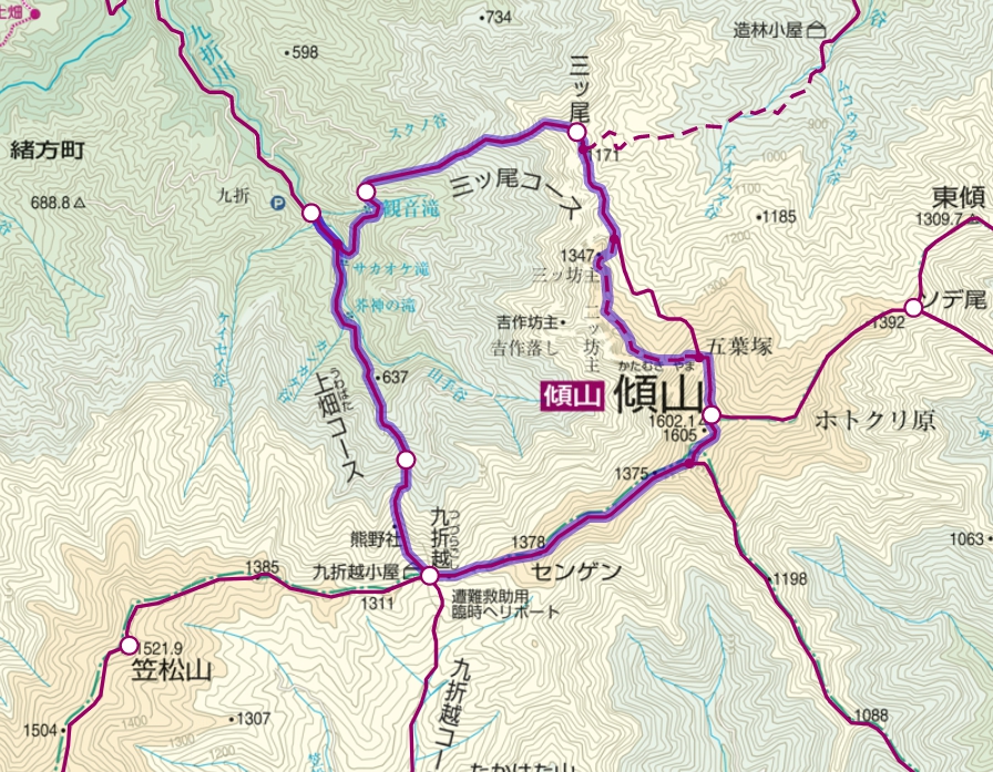 九折登山口→三つ尾→二つ坊主(迂回路でもよい)→傾山→九折越え→九折登山口