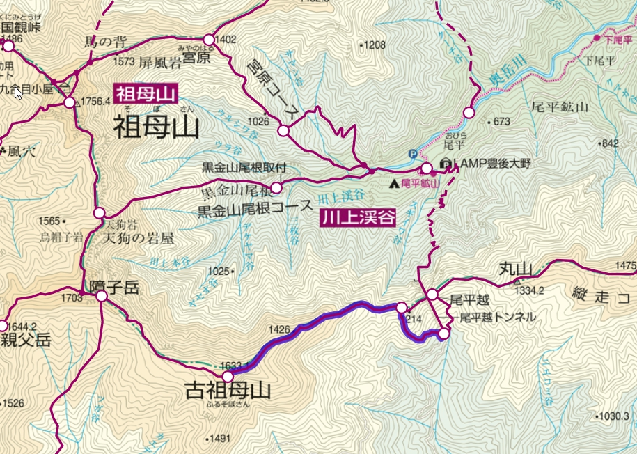 九折登山口→三つ尾→二つ坊主→傾山→本谷山→尾平越トンネル→尾平登山口